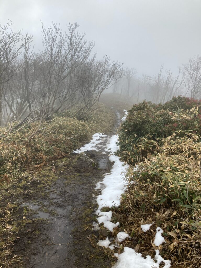 さて、山頂からAコースに向かって歩き始めると雪が残っている箇所がありました。