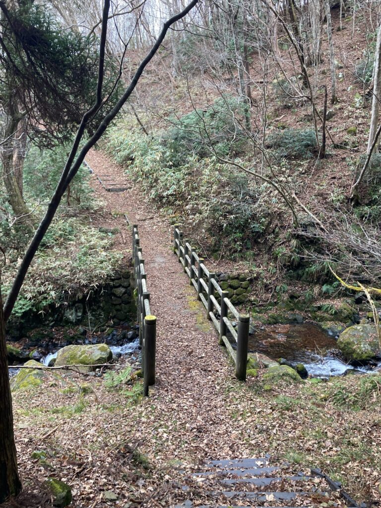 林道から階段状に整備された遊歩道になり沢に橋がかかるところまで下りてきました。