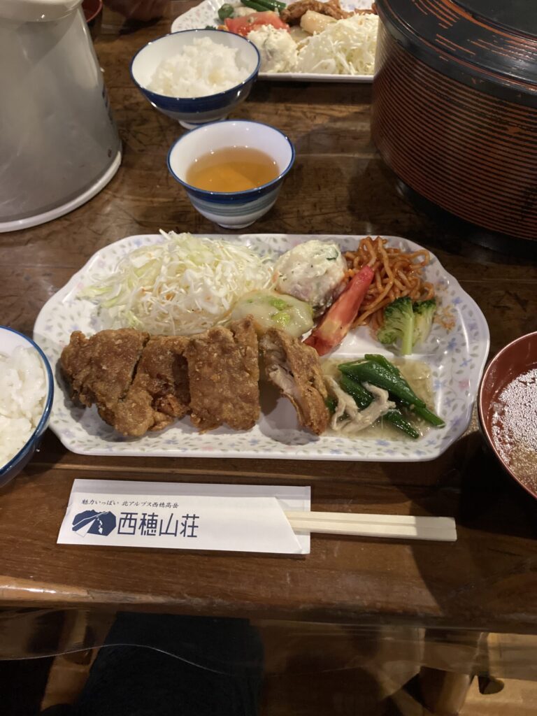 なお、西穂山荘の夕食は、鳥の山賊焼きをメインに野菜類もしっかりとあり、とてもおいしかったです。