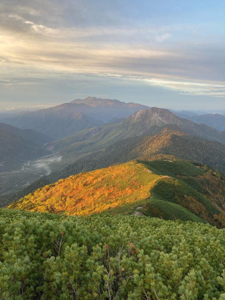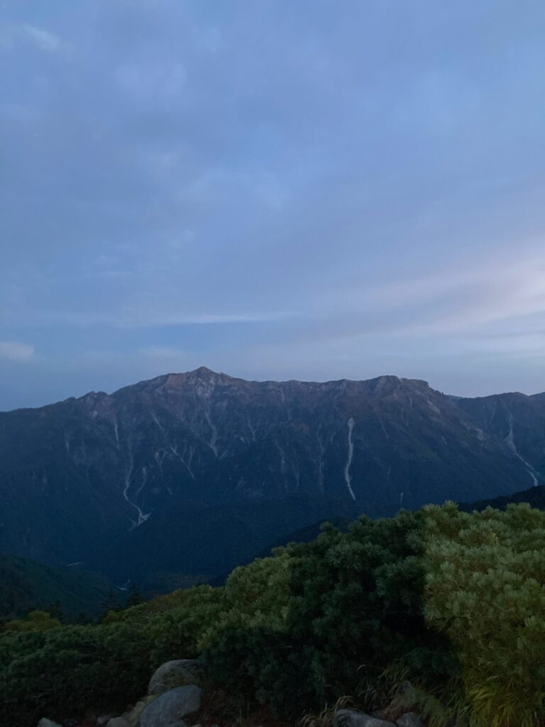 暗い中しばらく歩いていると空が白んで周りの山々の姿が見えてきました。